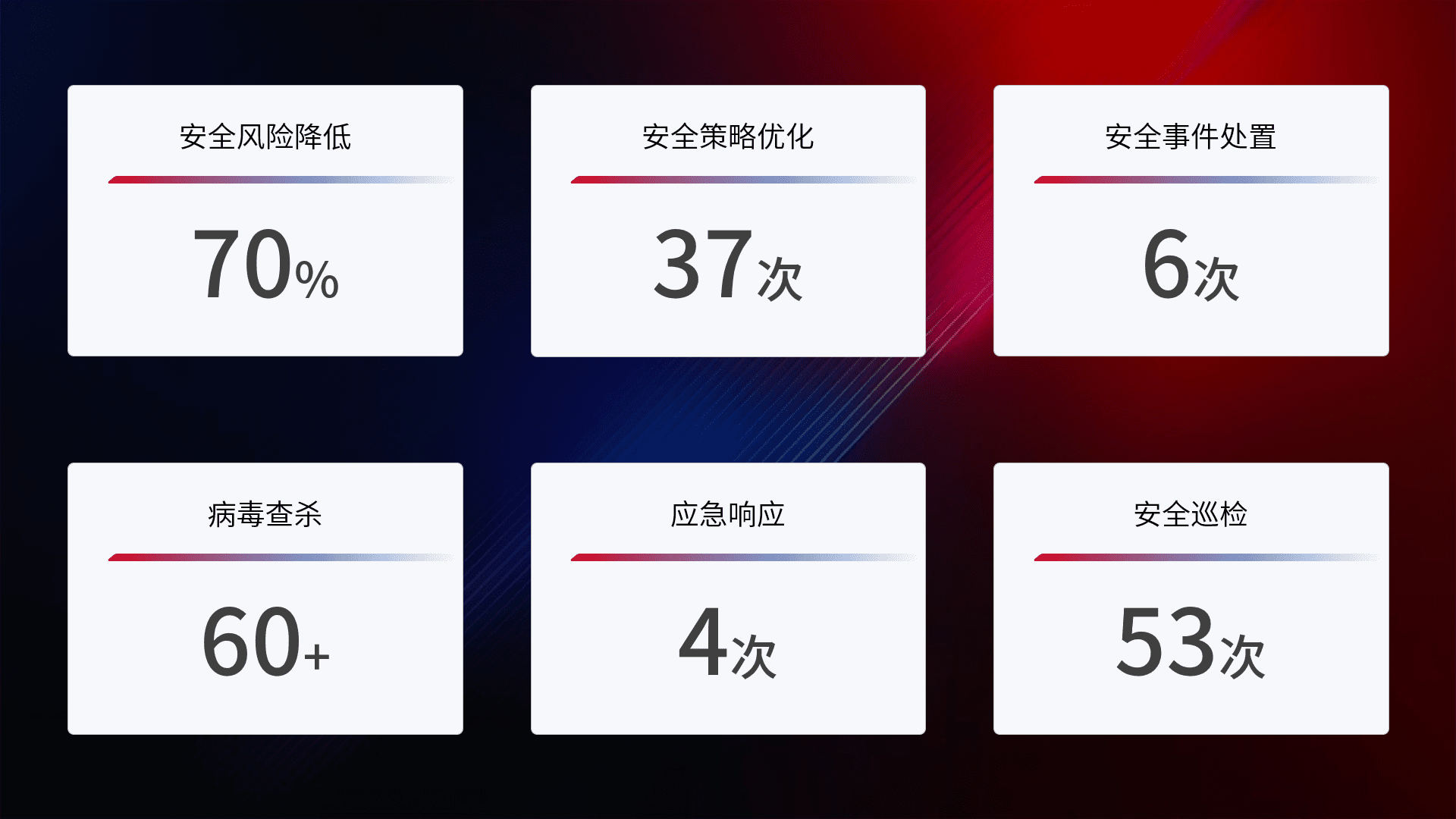 提供全面的安全事件报告体系,,,,包括处置报告、、周报、、季度和年度总结,,,结合持续监控,,,,帮助客户深入了解网络安全状况。。。